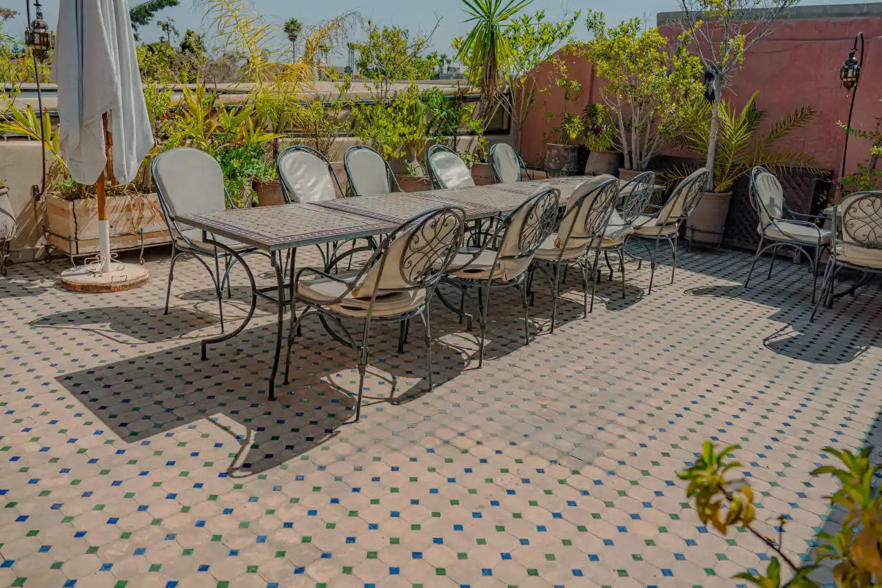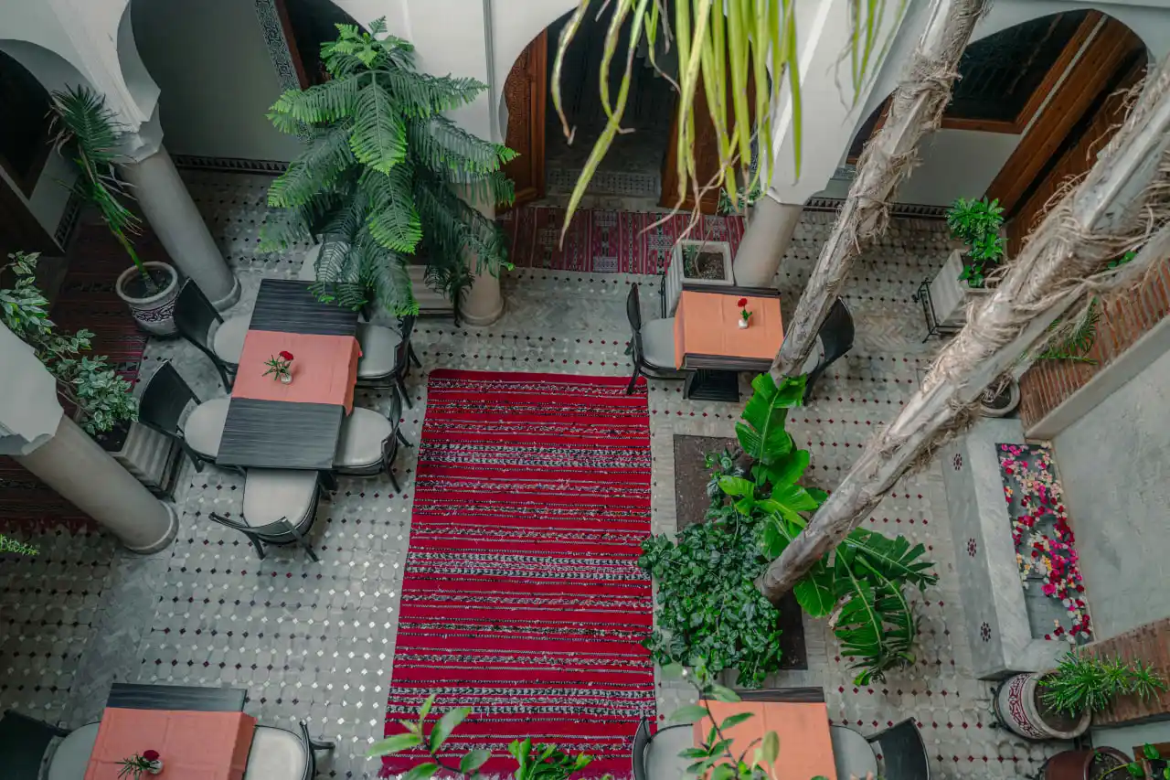 Unwind in our traditional patio, surrounded by lush greenery and soaring palm trees that reach towards the Marrakech sky